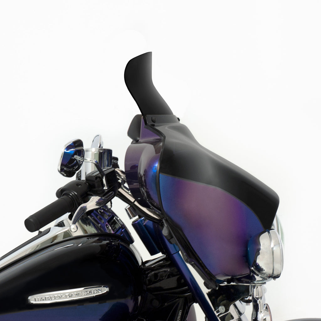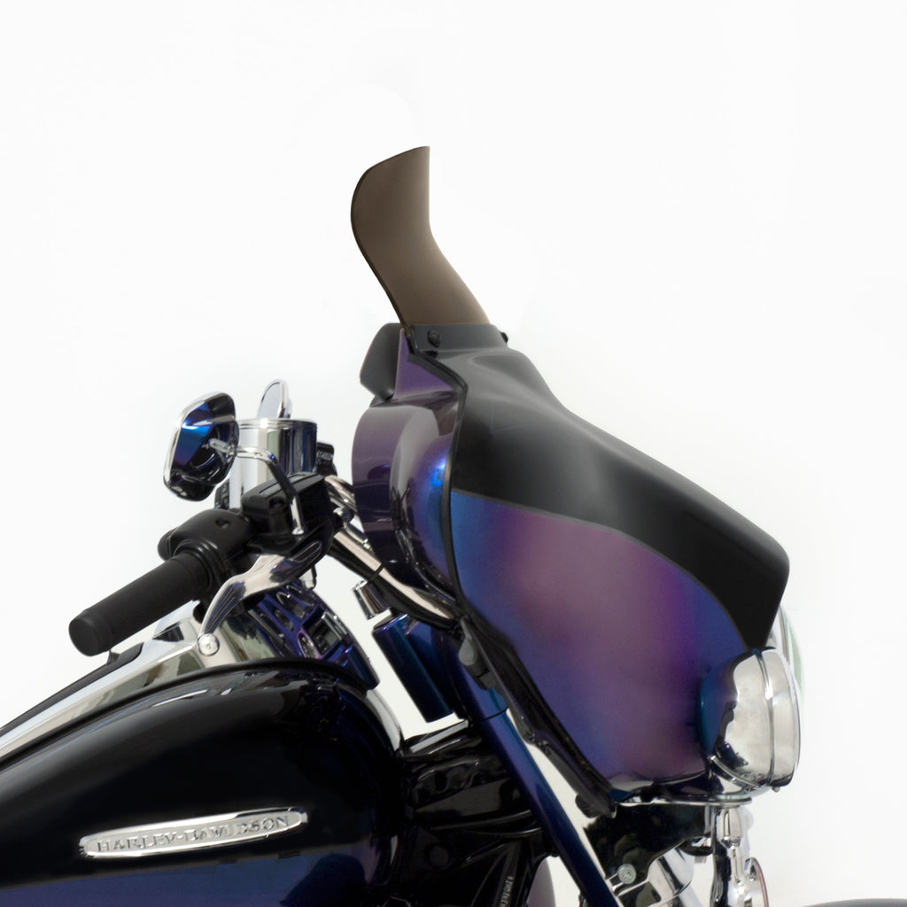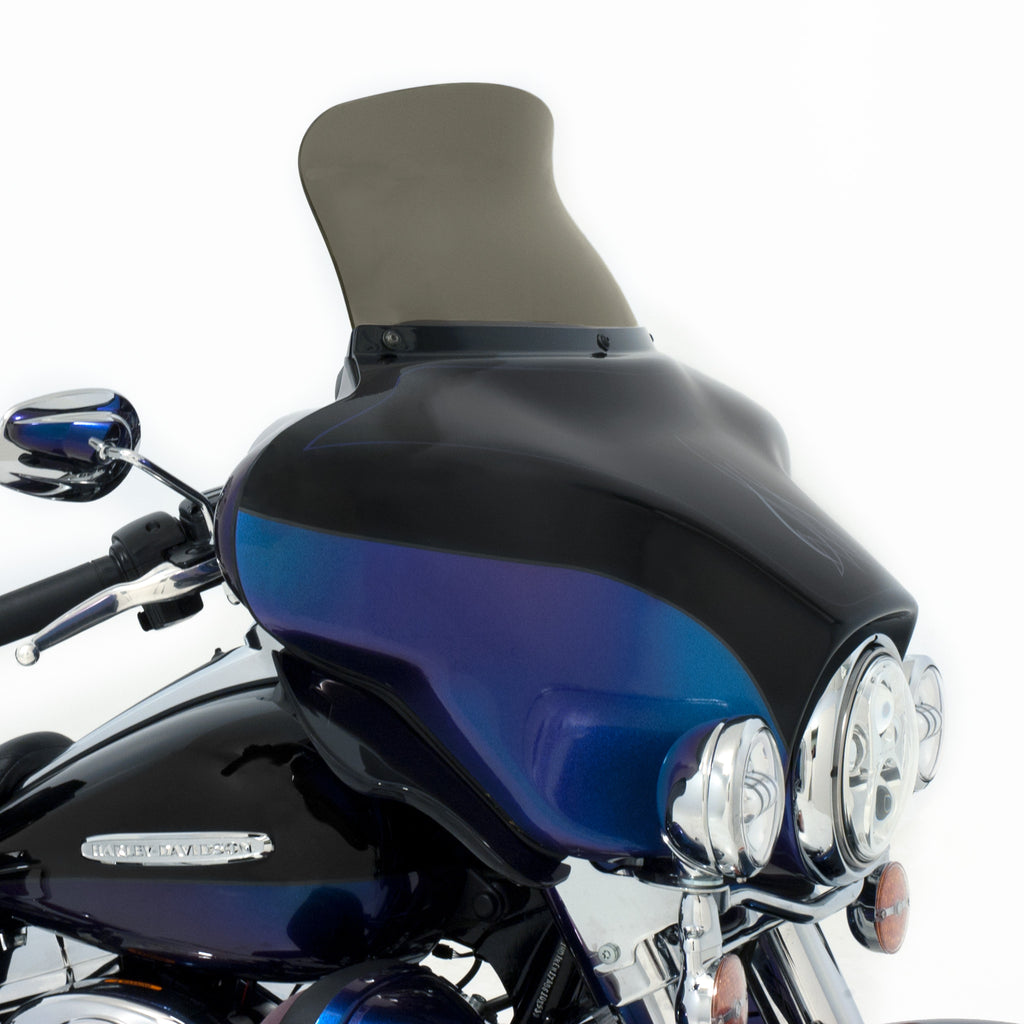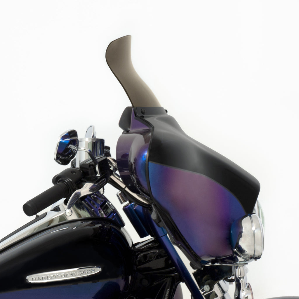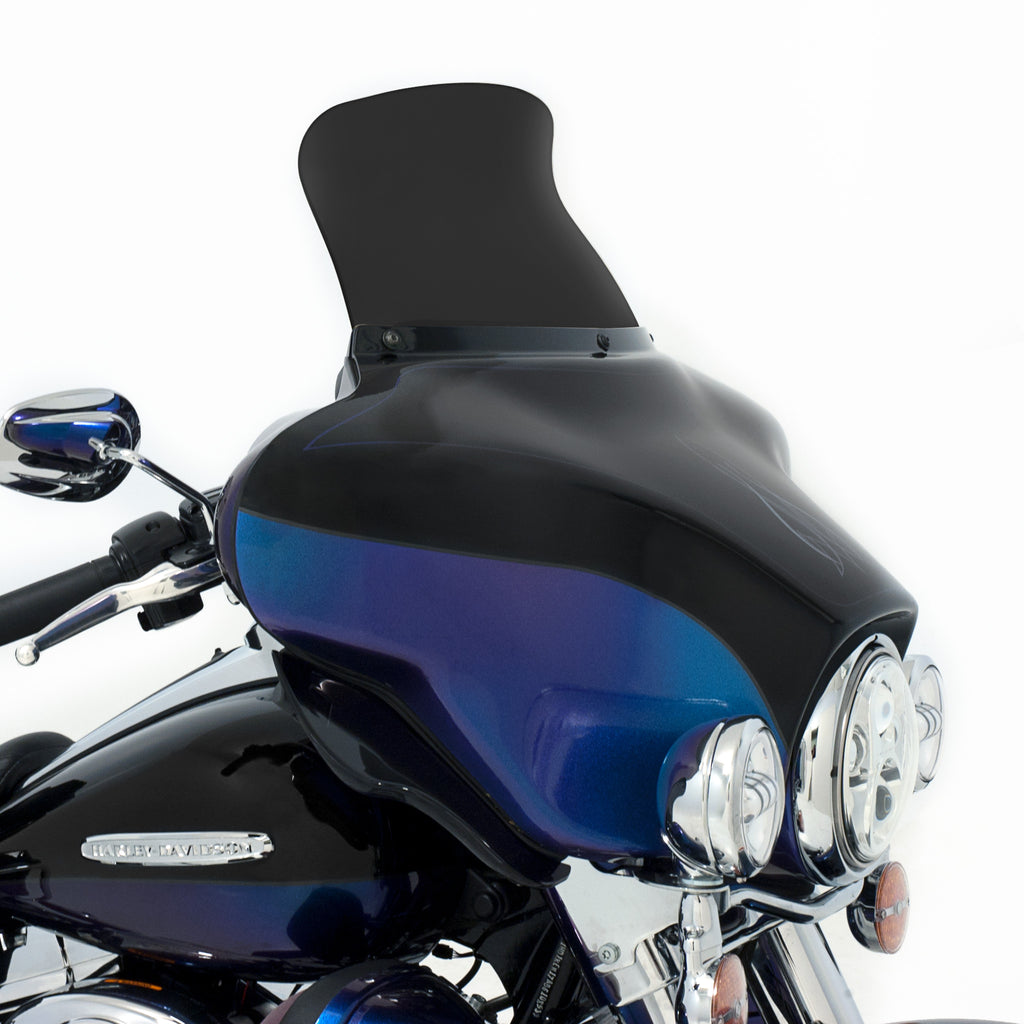 Be prepared to not be blown away; by wind turbulence that is. The Spoiler Windshield for your Harley Davidson Bagger was designed using industry leading CFD software and tested on thousands of miles of pavement to get real world feedback, the Soiler Windshield is the perfect example of "Less is More." The spoiler area of the windshield diffuses and slows down the airflow, leaving you in a buffeting free zone to ride in comfort. In testing, the Spoiler Windshield acts over 2.5" higher than it is, meaning a 5" spoiler does the work of an 7.5" straight windshield and so on. Run a lower shield than you normally would with our Spoiler Windshield and enjoy a clear field of vision with no buffetting!