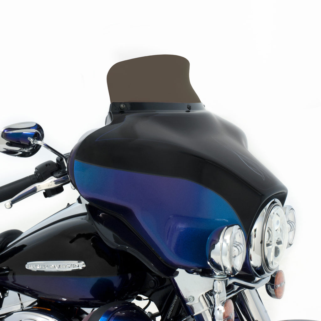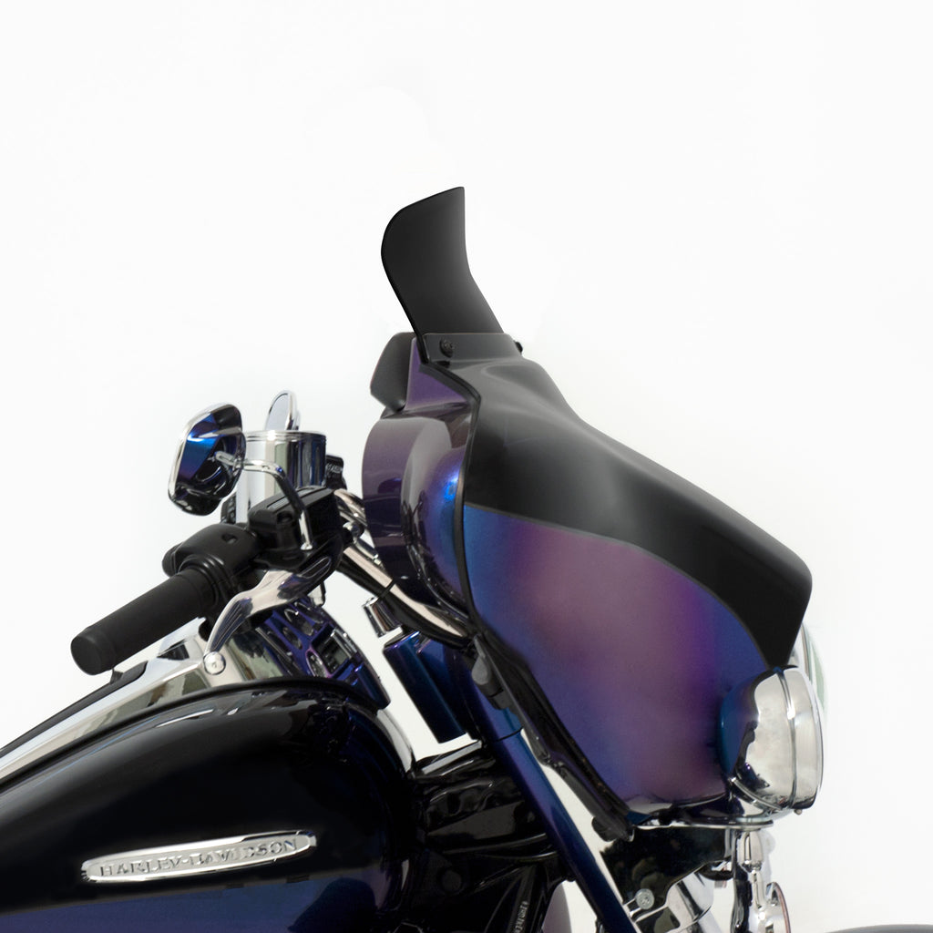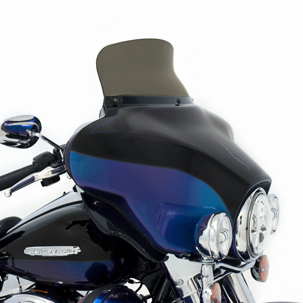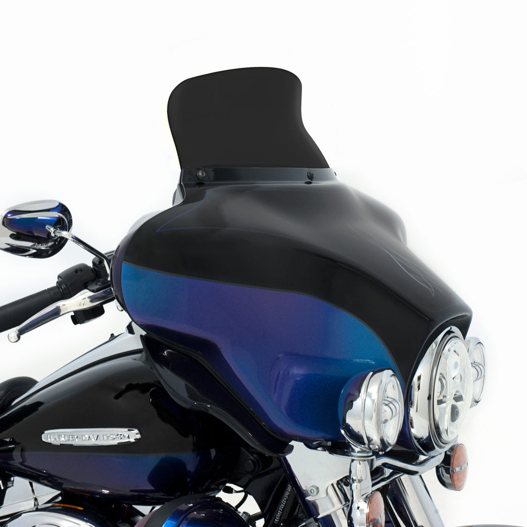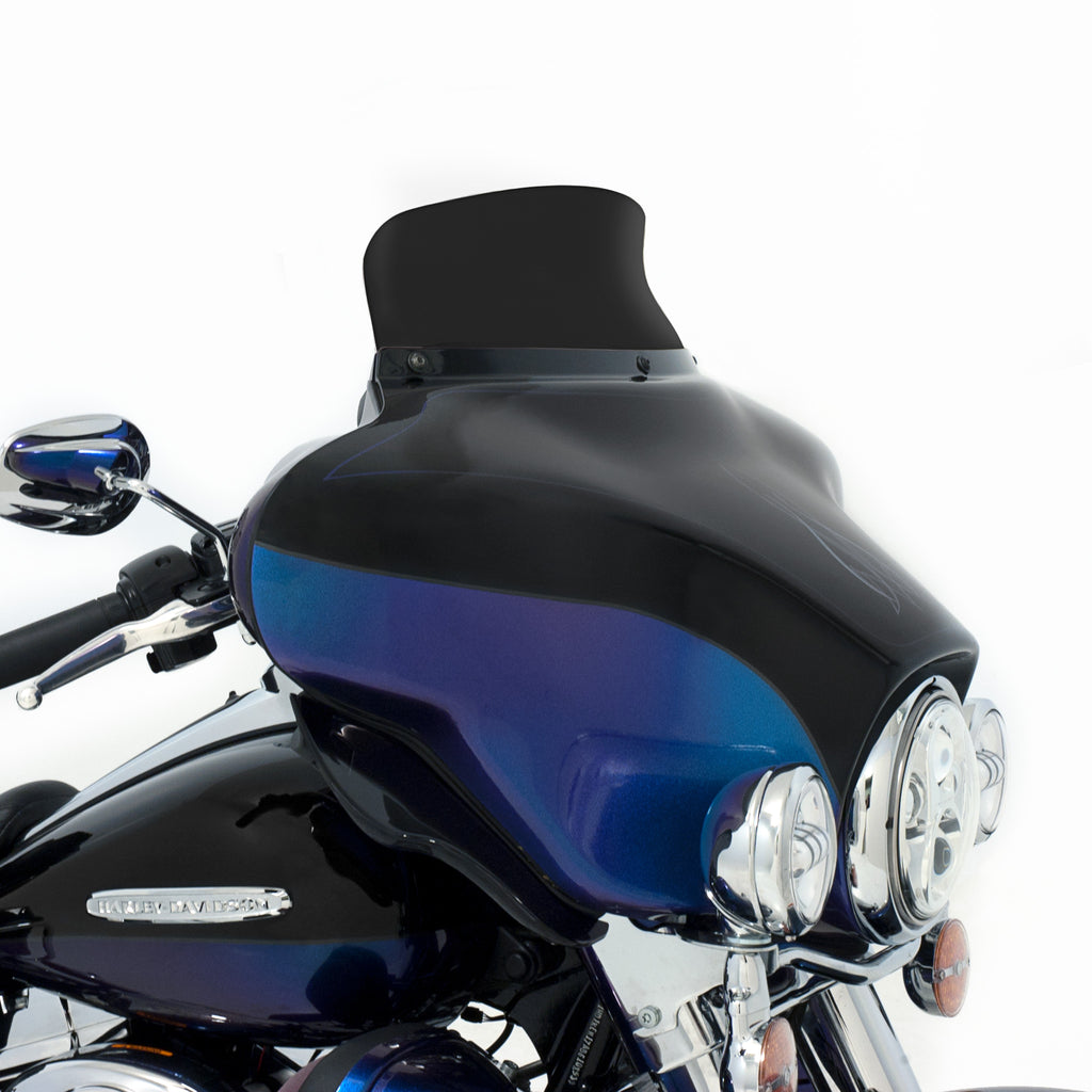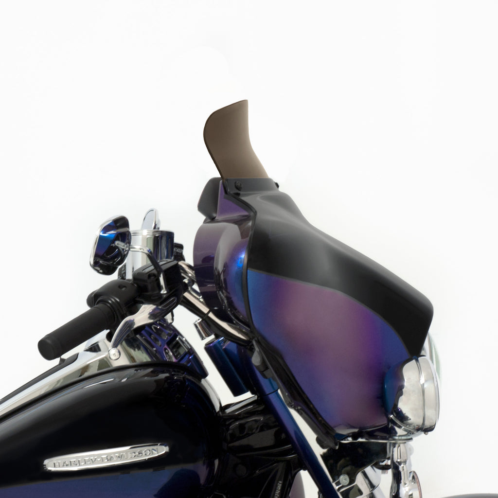Be prepared to not be blown away; by wind turbulence that is. The Spoiler Windshield for your Harley Davidson Bagger was designed using industry leading CFD software and tested on thousands of miles of pavement to get real world feedback, the Soiler Windshield is the perfect example of "Less is More." The spoiler area of the windshield diffuses and slows down the airflow, leaving you in a buffeting free zone to ride in comfort. In testing, the Spoiler Windshield acts over 2.5" higher than it is, meaning a 5" spoiler does the work of an 7.5" straight windshield and so on. Run a lower shield than you normally would with our Spoiler Windshield and enjoy a clear field of vision with no buffetting!