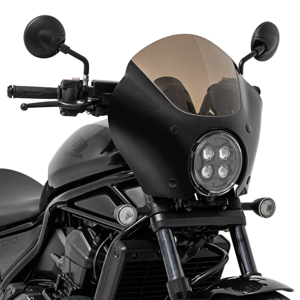The Gauntlet Fairing for the Honda Rebel 1100 provides a minimalist style and maximum function. A stylish quarter fairing, the Gauntlet® provides the Rebel 1100 with style you want and torso protection that you need for extended mile rides. The Gauntlet comes in a Gloss black Class-A finish which can also be easily painted.