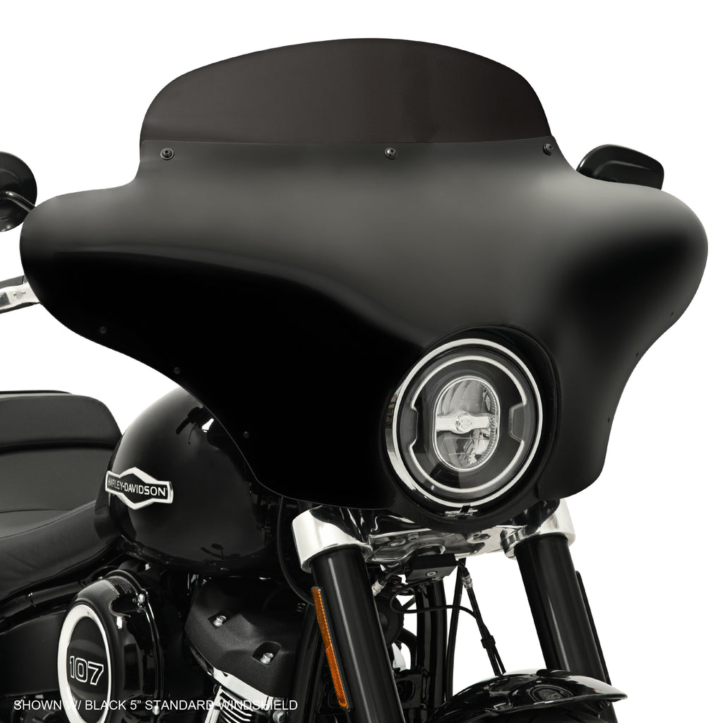 Looking to devour more miles of highway on your Harley-Davidson® Sport Gilde, then the Memphis Shades Batwing Fairing is the prefect blend of style and fanction for a sleek bagger style. While it looks great in it's factory finished Class-A gloss black surface, it can be easily painted to match your Sport Glide. Utilizing the Trigger-Lock mounting hardware the Batwing fairing is detachable, leaving only the blacked out anchoring hardware (fork clamps) on the forks. Memphis Shades Batwing fairing is the choice for style, performance and value - style that works!