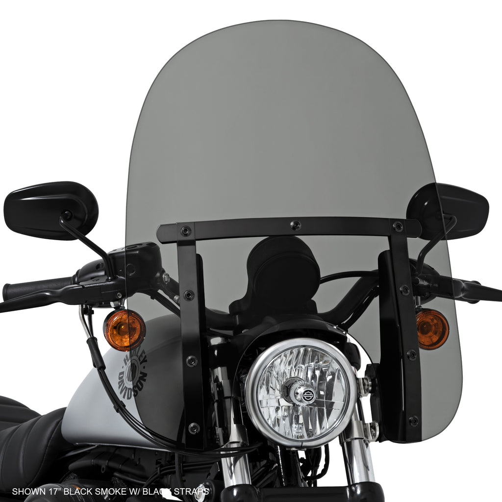 Constructed with the same quality and materials as its larger counterpart, the Slim offers the same timeless design with a tighter look while pushing a bit less wind for riders who prefer a more compact windshield. Black strap models feature electrocoated black stainless steel straps, CNC-machined billet aluminum fittings, and stainless steel hardware for long-lasting durability and corrosion resistance.