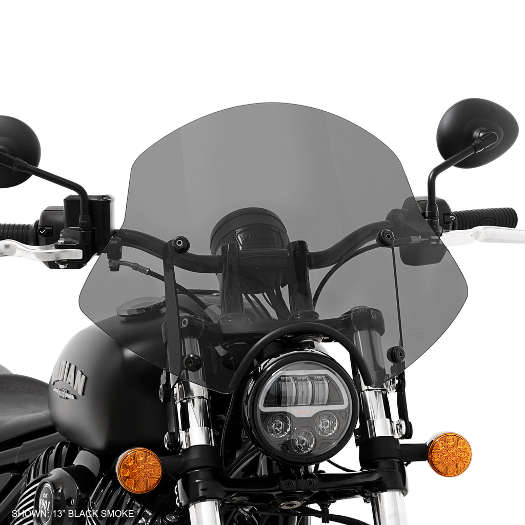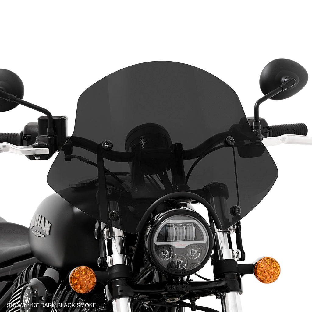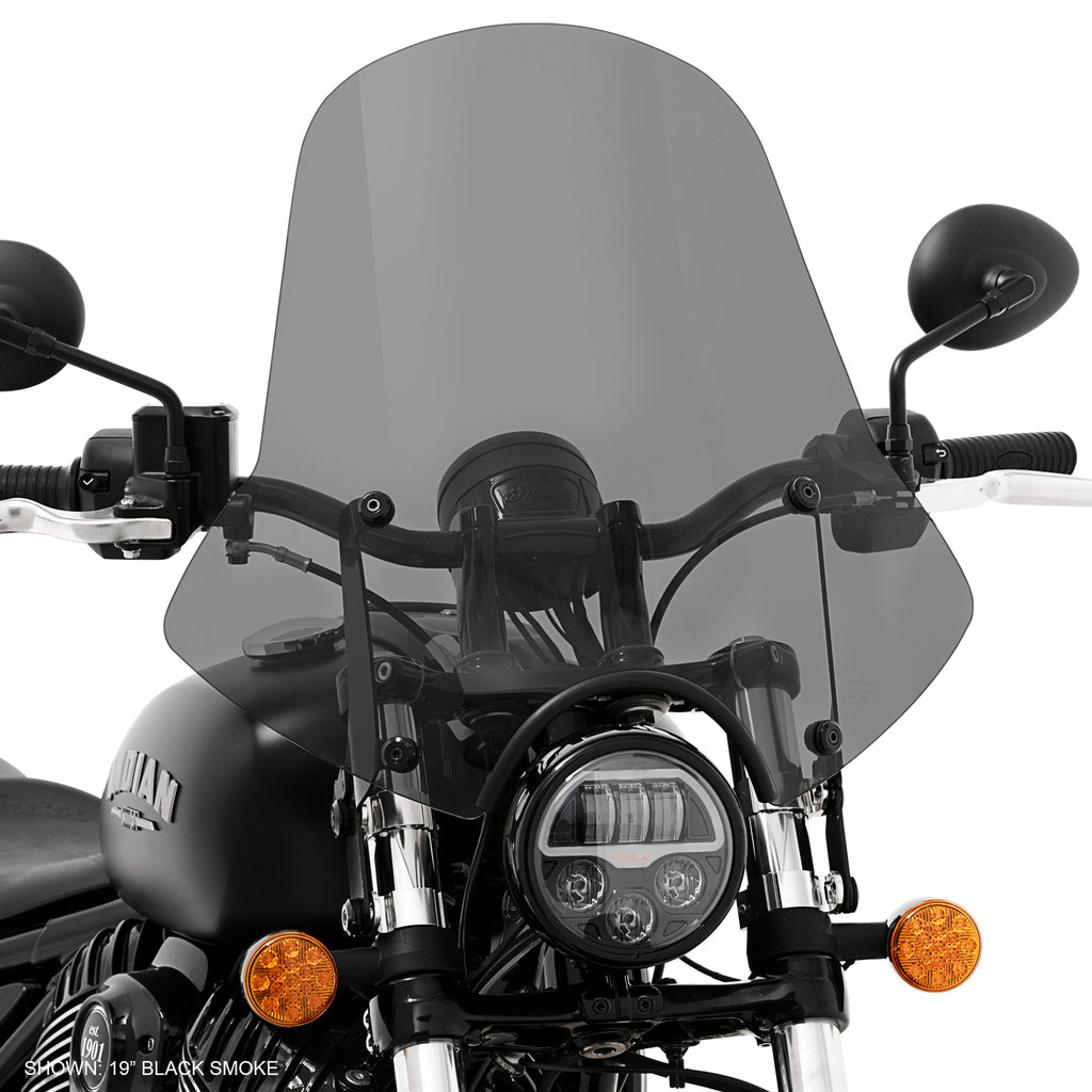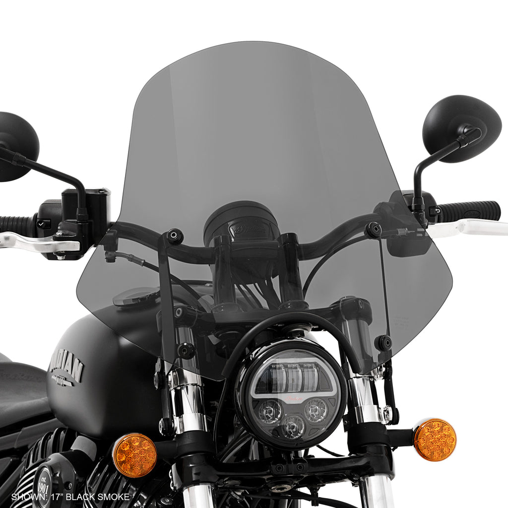 The Speed Demon Sportshield gives you the fast looks and great protection that you want in a motorcycle windshield. With it's small winged design, this sportshield is designed to give riders a sleek, stylish, and effective windshield. The Speed Demon is available in four NEW heights of 13”, 15”, 17”, or 19” - above the headlight, and measuring 22” wide. Fast style, great looks and great fit, the Speed Demon delivers it all.