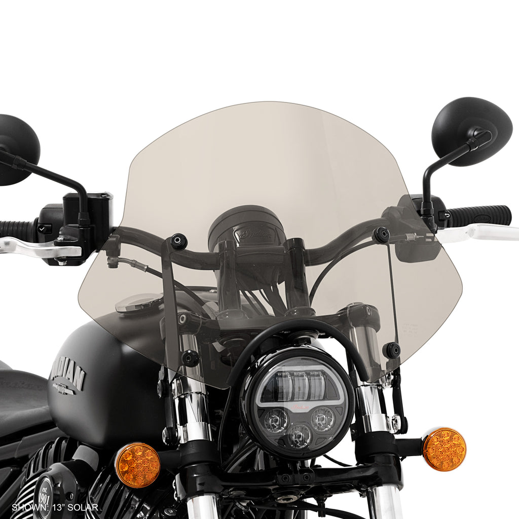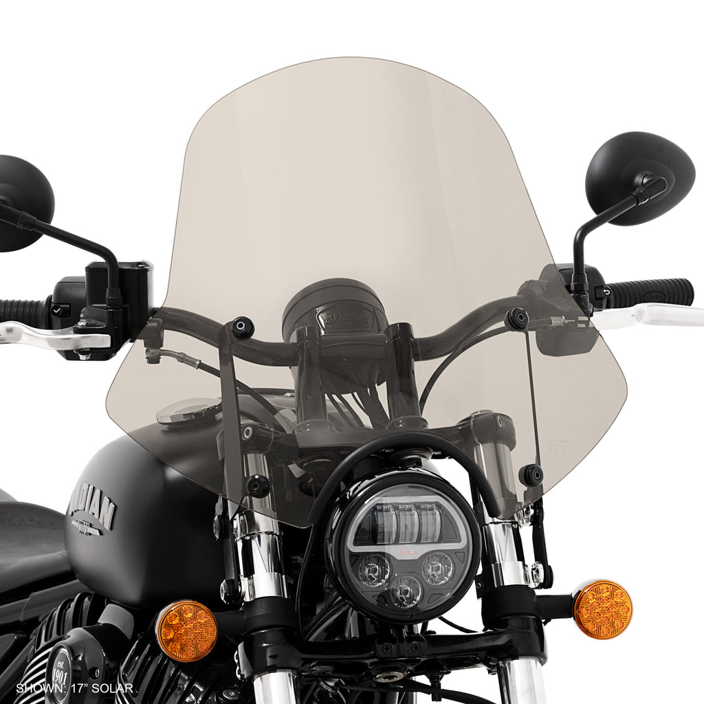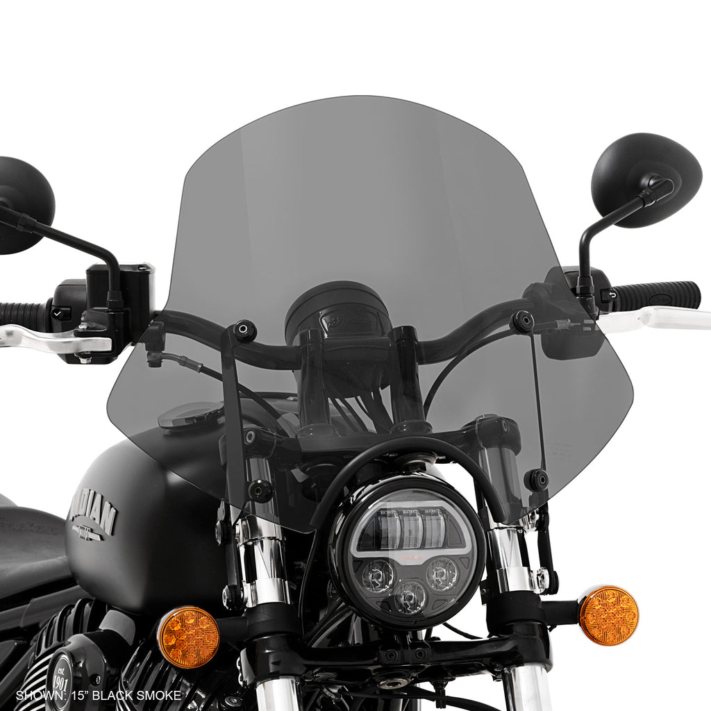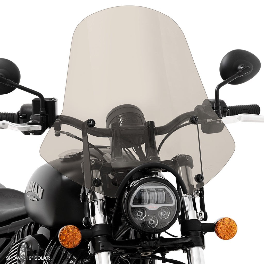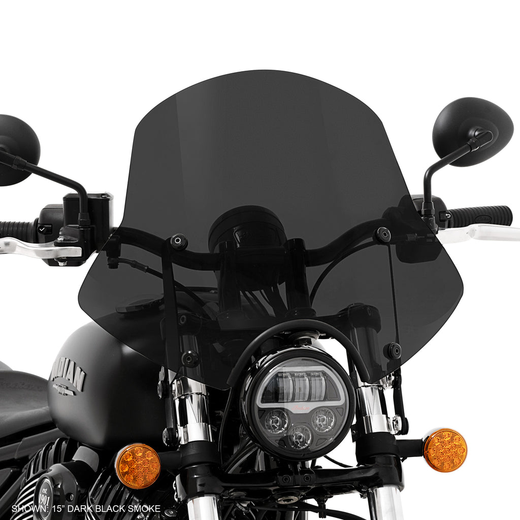 The Speed Demon Sportshield gives you the fast looks and great protection that you want in a motorcycle windshield. With it's small winged design, this sportshield is designed to give riders a sleek, stylish, and effective windshield. The Speed Demon is available in four NEW heights of 13”, 15”, 17”, or 19” - above the headlight, and measuring 22” wide. Fast style, great looks and great fit, the Speed Demon delivers it all.