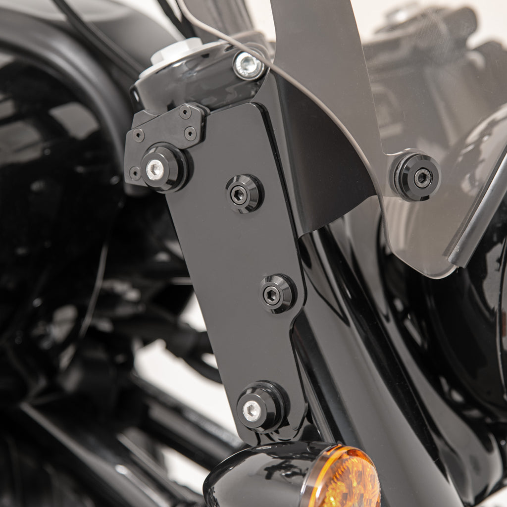 Trigger-Lock™ Mounting Kits consist of anchoring hardware (the part that stays on the bike), and mounting plates (the part that connects the fairing or windshield to the bike). “Plates Only” kits can be use when you already have Memphis Shades Trigger-Lock anchoring hardware on your bike. For example, if you already run, say, a Gauntlet fairing, you could mount a windshield or another fairing using “Plates Only”.