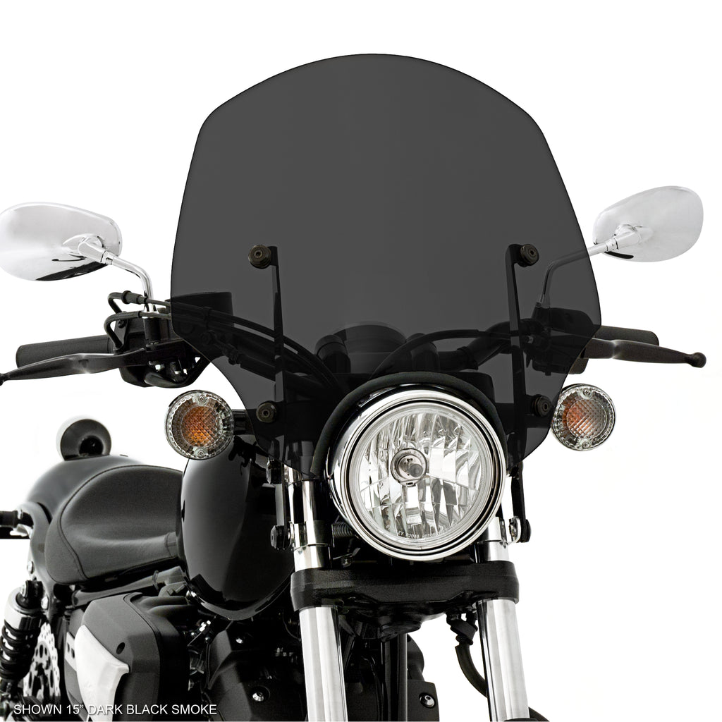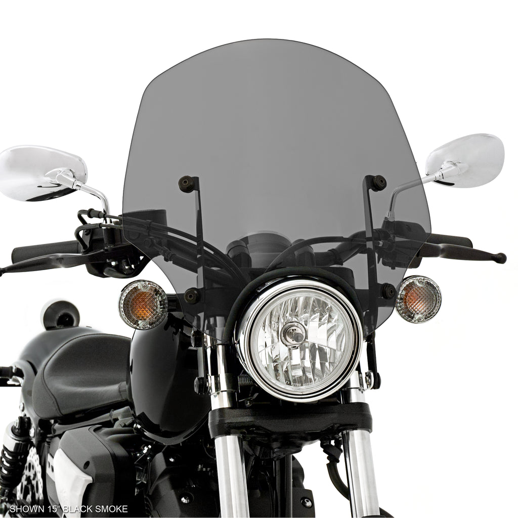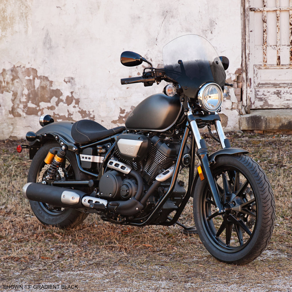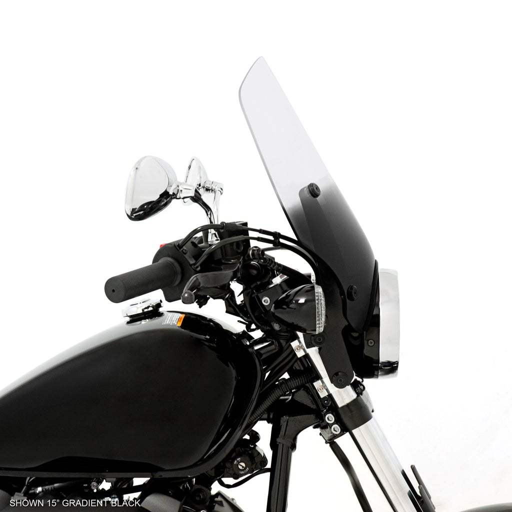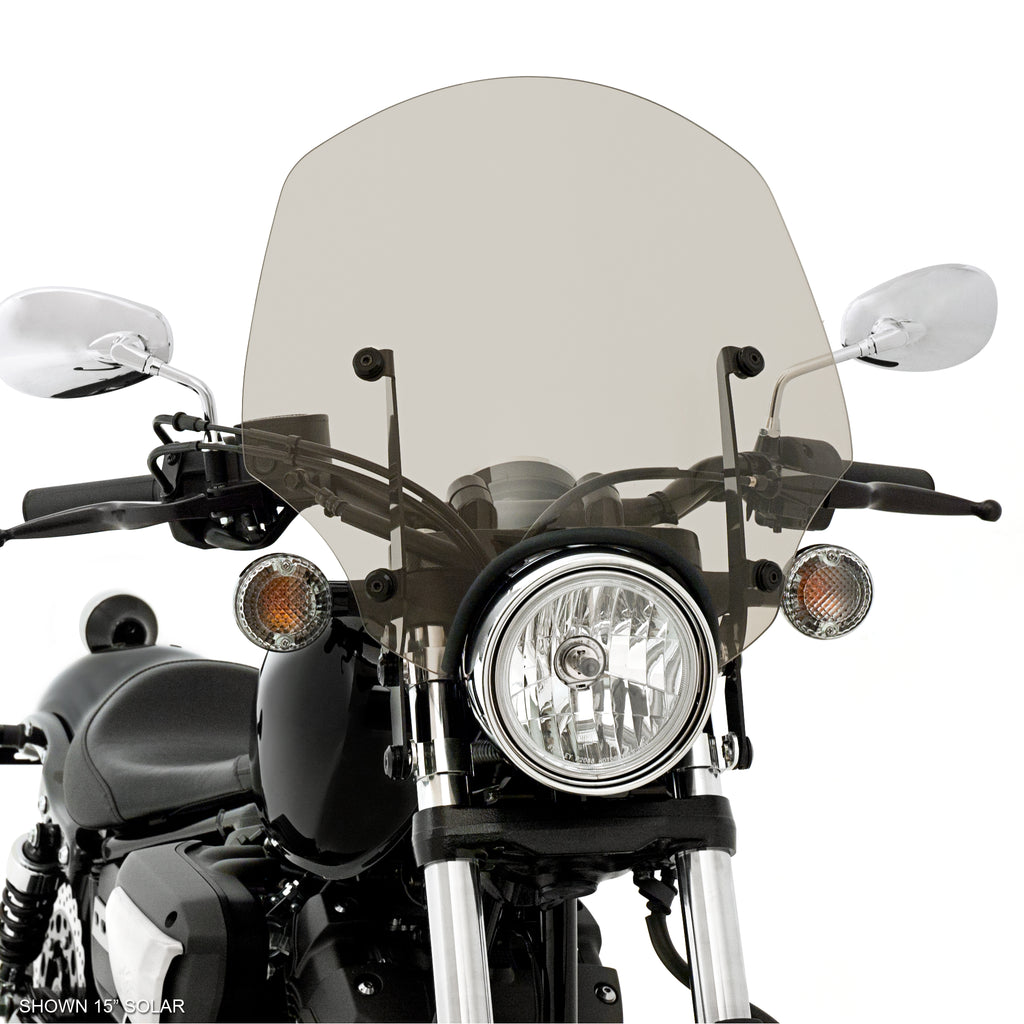 The El Paso sportshield was originally designed and sold for the Harley Sportster. Styled to expose handlebar or high mounted turn signals, the El Paso is now available in new Bolt inspired sizes of 13” and 15” in addition to the former offerings of 17” and 19”, and fits bikes with 5 ¾”-7” headlights.