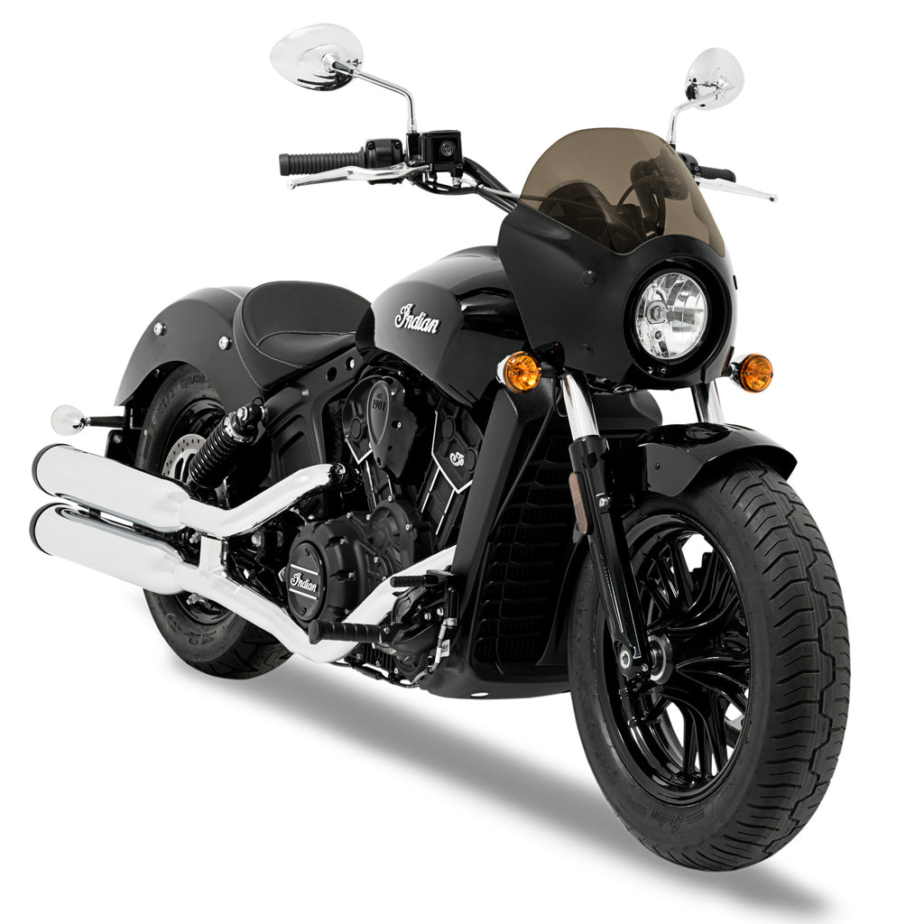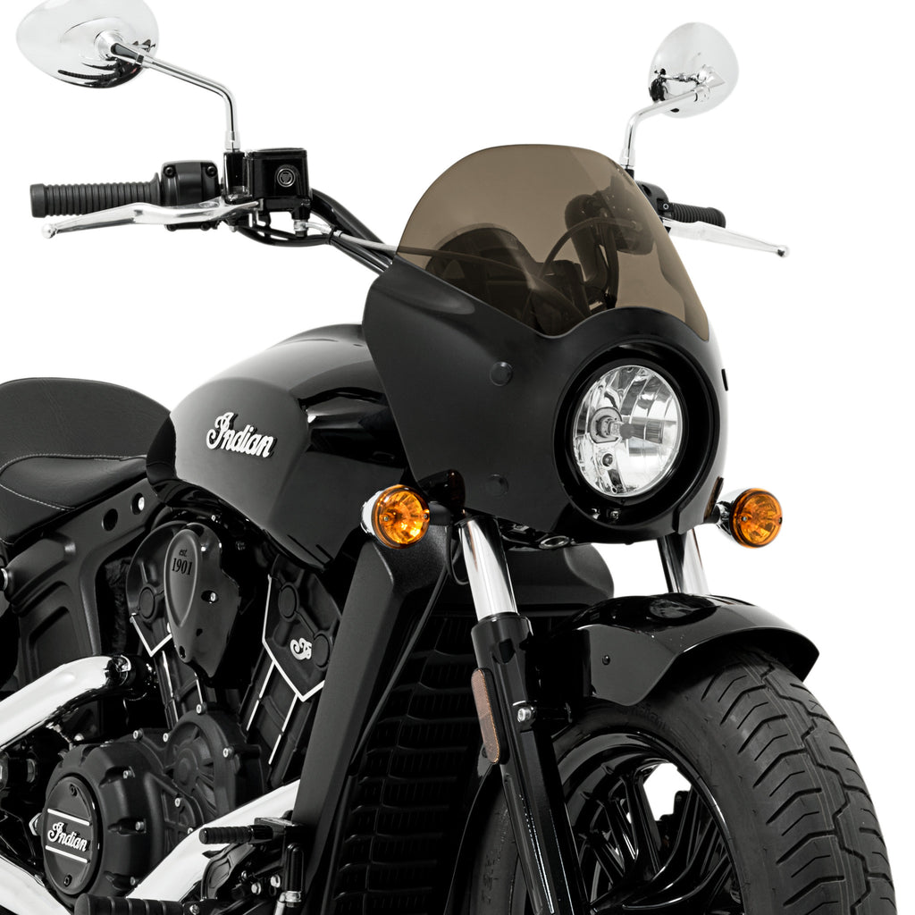 The Cafe fairing gives the 2015 - 2024 Indian Scout and Indian Scout-Sixty a compact and sleek design fairing, providing a modern look with classic features. The Cafe fairing comes in a gloss black Class-A finish, so you can leave it stock or easily prep it for paint to match your very own style.